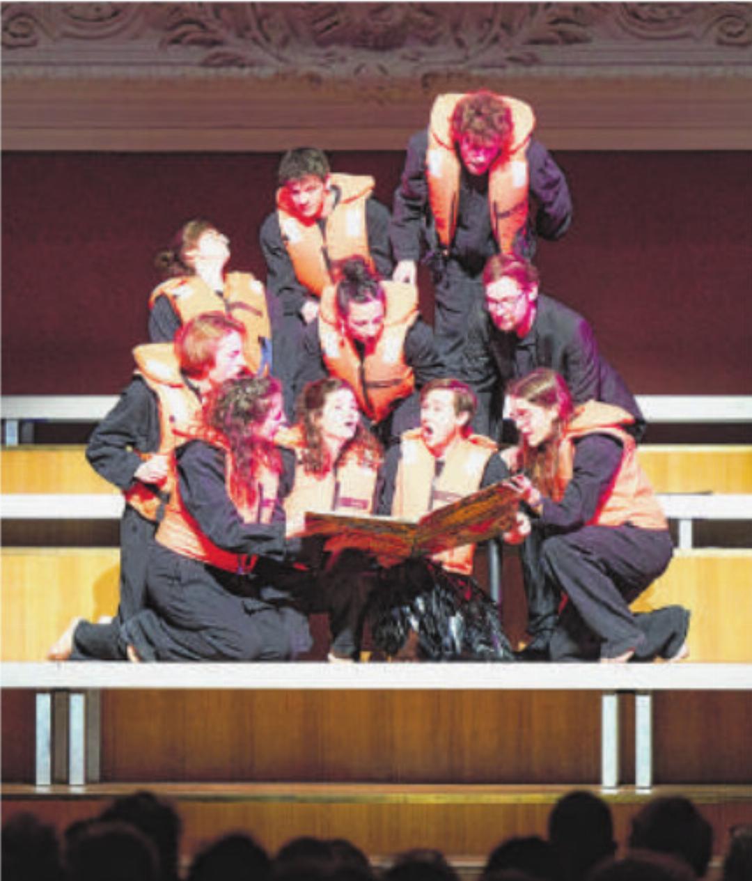 Dieser Umgang, diese Dringlichkeit und das Miteinander sind im Stadtcasino hautnah zu erleben. Wenn die Chöre nicht singen, lässt Mondry die Orgel erklingen, etwa mit «Deuxième Fantaisie» von Jehan Alain (1912–1940). Auch hier pure Dramatik, welche die Schwimmwesten auf der Bühne gekonnt ins Bild bringen. Schliesslich hocken sie in der Bühnenmitte zusammen und rezitieren «Once upon a time the world was round» von John Cage (1912–1992). Die Stimmung zieht sich zusammen und ein leichter Schauder läuft den Rücken herunter. Aufund Erlösung gibt es mit der Kantate «Dievs! Tava zeme deg» («Gott! Deine Erde brennt») der lettischen Komponistin Luˉ cija Garuˉ ta (1902–1977). Trotz der Dramatik ihres Stückes lässt sich das Ganze gut hören, die Musik ist eher traurig als wütend. Besonders zu erwähnen sind hier die Soli von Tenor David Ferreira und Bariton Kimon Barakos, die Garuˉ tas Worte emotional sehr bewegend intonieren.