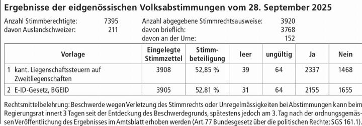 Rechtsmittelbelehrung: Beschwerde wegen Verletzung des Stimmrechts oder Unregelmässigkeiten bei Abstimmungen kann beim Regierungsrat innert 3 Tagen seit der Entdeckung des Beschwerdegrunds, spätestens jedoch am 3. Tag nach der ordnungsgemässen Veröffentlichung des Ergebnisses im Amtsblatt erhoben werden (Art.77 Bundesgesetz über die politischen Rechte; SGS 161.1).