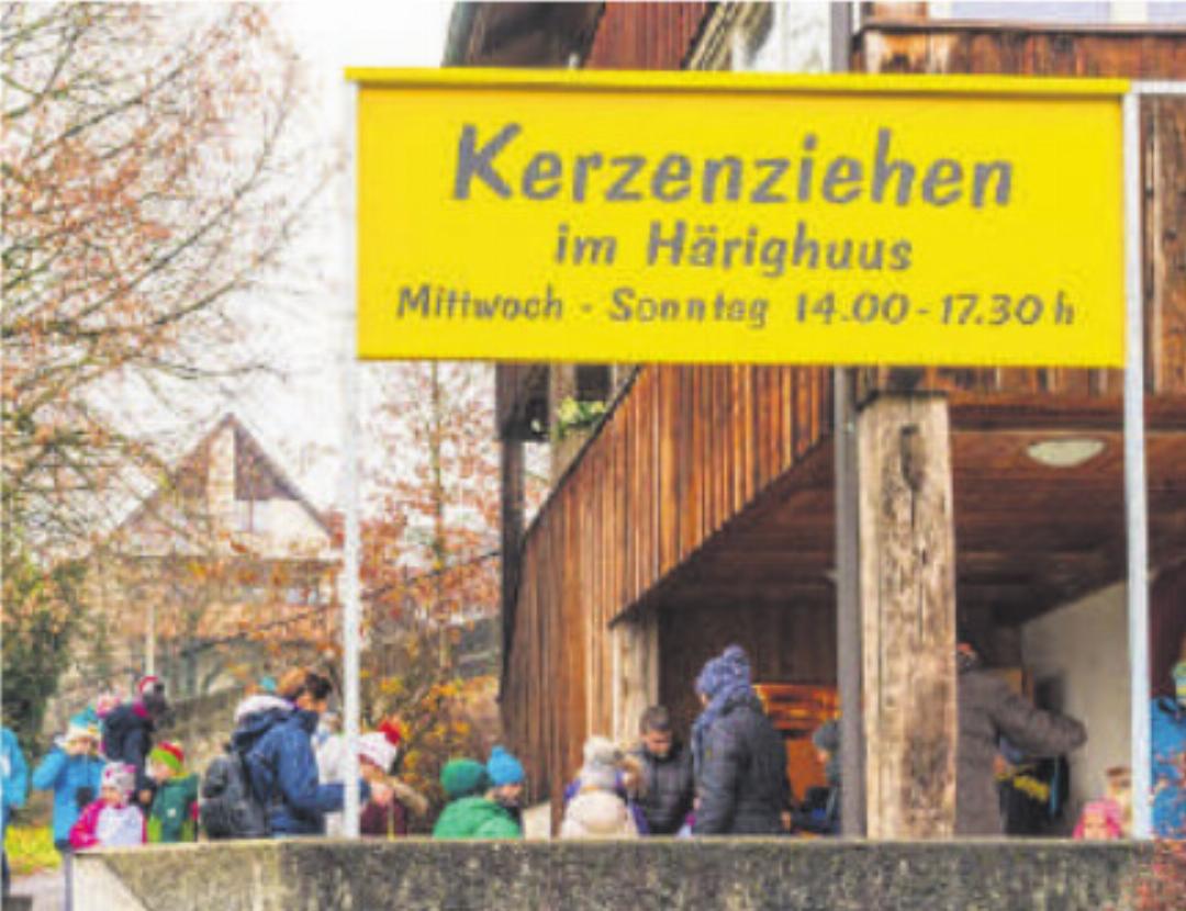 Vom Samstag, 6. Dezember, bis Sonntag, 14. Dezember, (am Montag, 8. Dezember kein Kerzenziehen) können Besucherinnen und Besucher täglich von 14 bis 17.30 Uhr ihre eigenen Kerzen ziehen – am Wochenende sogar bis 18.30 Uhr. Die letzte Dochtausgabe erfolgt jeweils um 17 Uhr. In liebevoller Handarbeit entstehen kleine Kunstwerke aus Bienenwachs oder Paraffin/ Stearin. Das Material wird nach Gewicht verrechnet: Bienenwachs: (60 %): Fr. 5.–/100 g (inkl. Docht), Paraffin/Stearin: Fr. 3.–/ 100 g. Während die Kerzen Schicht für Schicht Form annehmen, lädt das gemütliche Häriggewölbe zum Verweilen ein. Dort warten feine Sandwiches, Tees, Kaffee, Kuchen, ect. auf Sie.