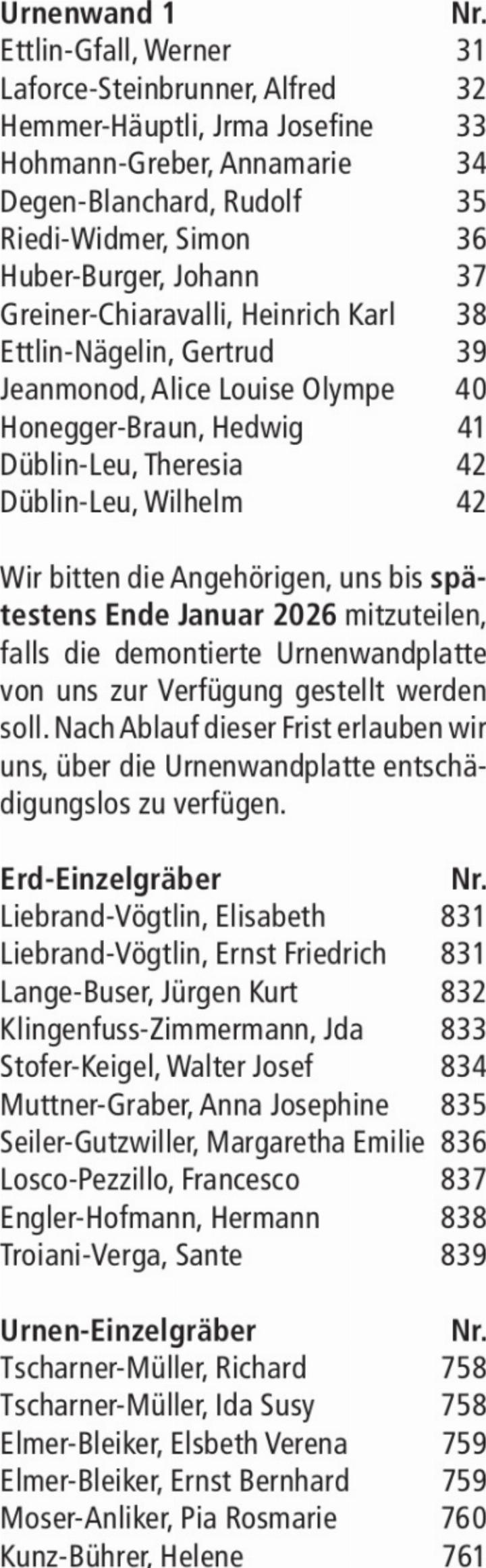 Wir bitten die Angehörigen, das Grab bis spätestens Ende Januar 2026 abzuräumen. Nach Ablauf dieser Frist erlauben wir uns, über das verbliebene Grabmal und die Pflanzen entschädigungslos zu verfügen.
