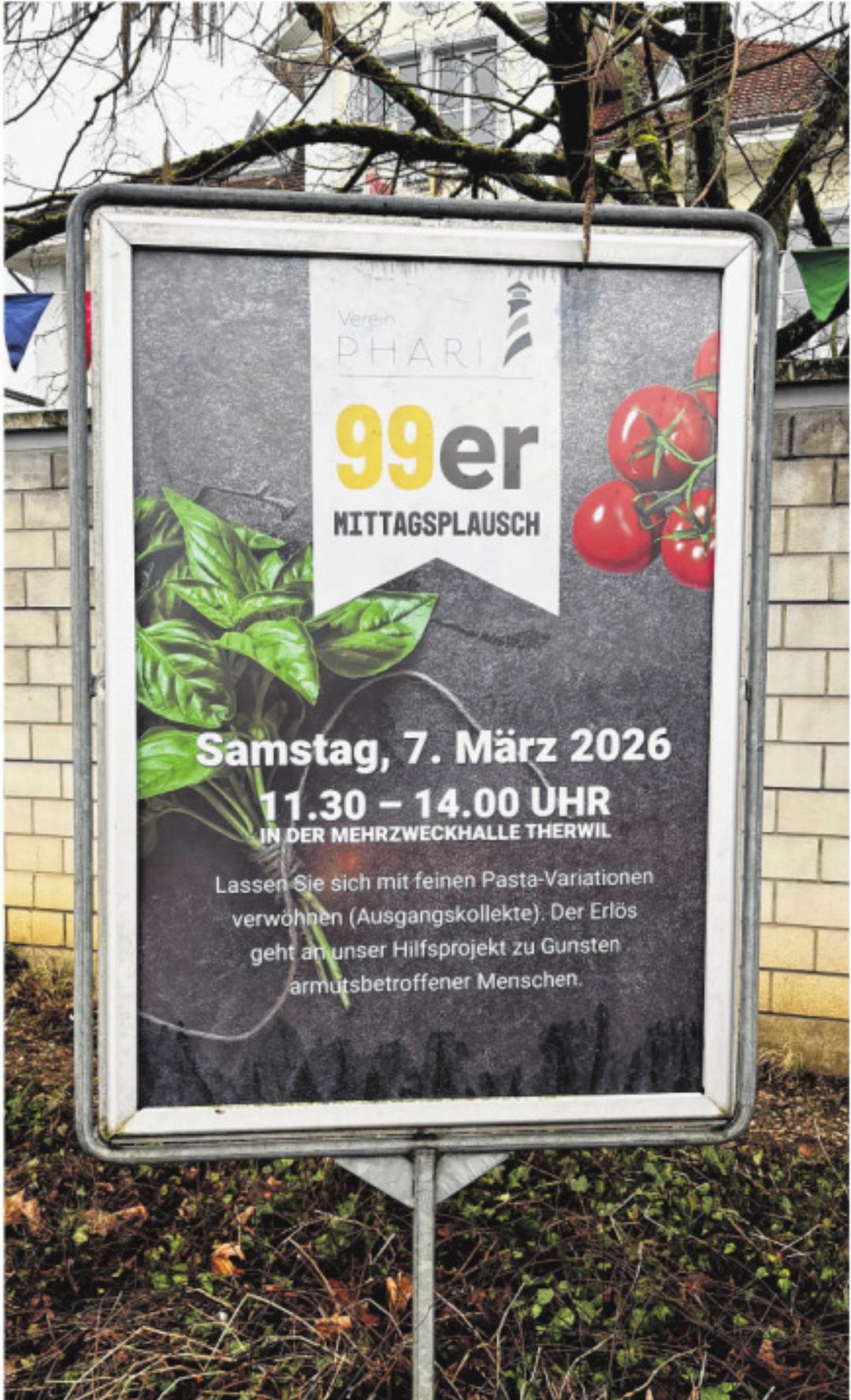 Am Samstag, 7. März, laden wir Sie herzlich ein, von 11.30 bis 14 Uhr in der Mehrzweckhalle Therwil köstliche Pasta-Variationen mit frischem Salat zu geniessen. Zum süssen Abschluss erwartet Sie ein variantenreiches Kuchenbuffet.