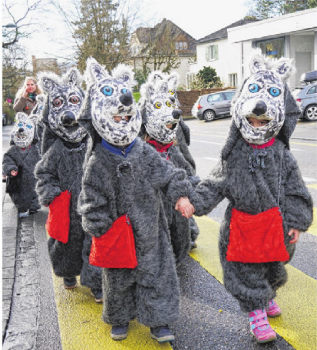 Die Kita-Gruppen, Kindergärten und Schulklassen haben wiederum keine Mühen gescheut, um die Schulfasnacht zu einem farbenfrohen Spektakel zu machen. Hoch im Kurs liegen traditionell Tiere in allerlei Varianten. «Wir sehen grau», heisst es bei einer Klasse Mäuse auf einem Schild. Farbenfroh präsentiert sich eine Klasse Raben, die eine Botschaft zu verkünden haben: «Der Pausenplatz ist grau und leer, bunte Raben – Farbe her!»