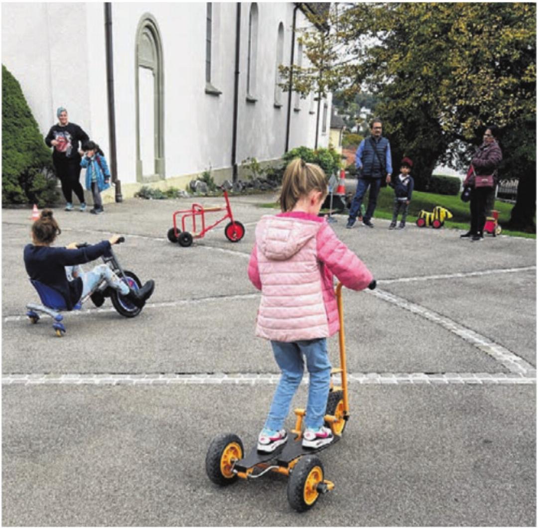 Wer es lieber grösser mag, kann sich bei Grossspielen wie Spirobille, Pukasi, Weykick oder Shuffle Ball vergnügen. Kreative Baumeister betätigen sich spielerisch konstruktiv und bauen fantasievolle Gebilde aus Kapla-Holzplättchen oder farbigen Bechern. Auch für Bewegung ist gesorgt mit dem Fahrzeugpark im Innenhof des Pfarreiheims. Auf den speziellen Fahrzeugen der Ludothek wie Känguruhvelo, Einrad, Go-Kart oder Dreirad-Taxi mit Doppelsitz können Runden gedreht werden.