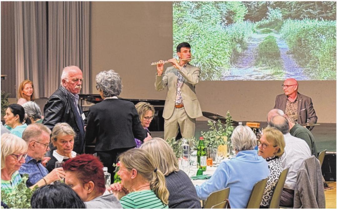 Um 18.30 Uhr war der Besucherandrang vor der Aula gross. Während an der Garderobe noch Jacken und Mäntel aufgehängt wurden, herrschte beim Buffet bereits grosser Andrang. Bürgerrats- und Gemeindepräsident Christian Caderas begrüsste die Besucherinnen und Besucher: «Wir haben 120 Anmeldungen erhalten», berichtete er. Rund um die Stehtischchen standen die Leute in angeregte Gespräche vertieft. Auf der Bühne spielten The Moody Tunes: Bandleader Christian Müller (Saxofon, Querflöte), Bettina Urfer (Klavier) und Cyrill Lützelschwab (Schlagzeug). Zu ihrer «I am Sailing»- Version verschob sich das Geschehen zusehends in die Aula. Drinnen warteten lange, festlich gedeckte Tafeln auf die Anwesenden.