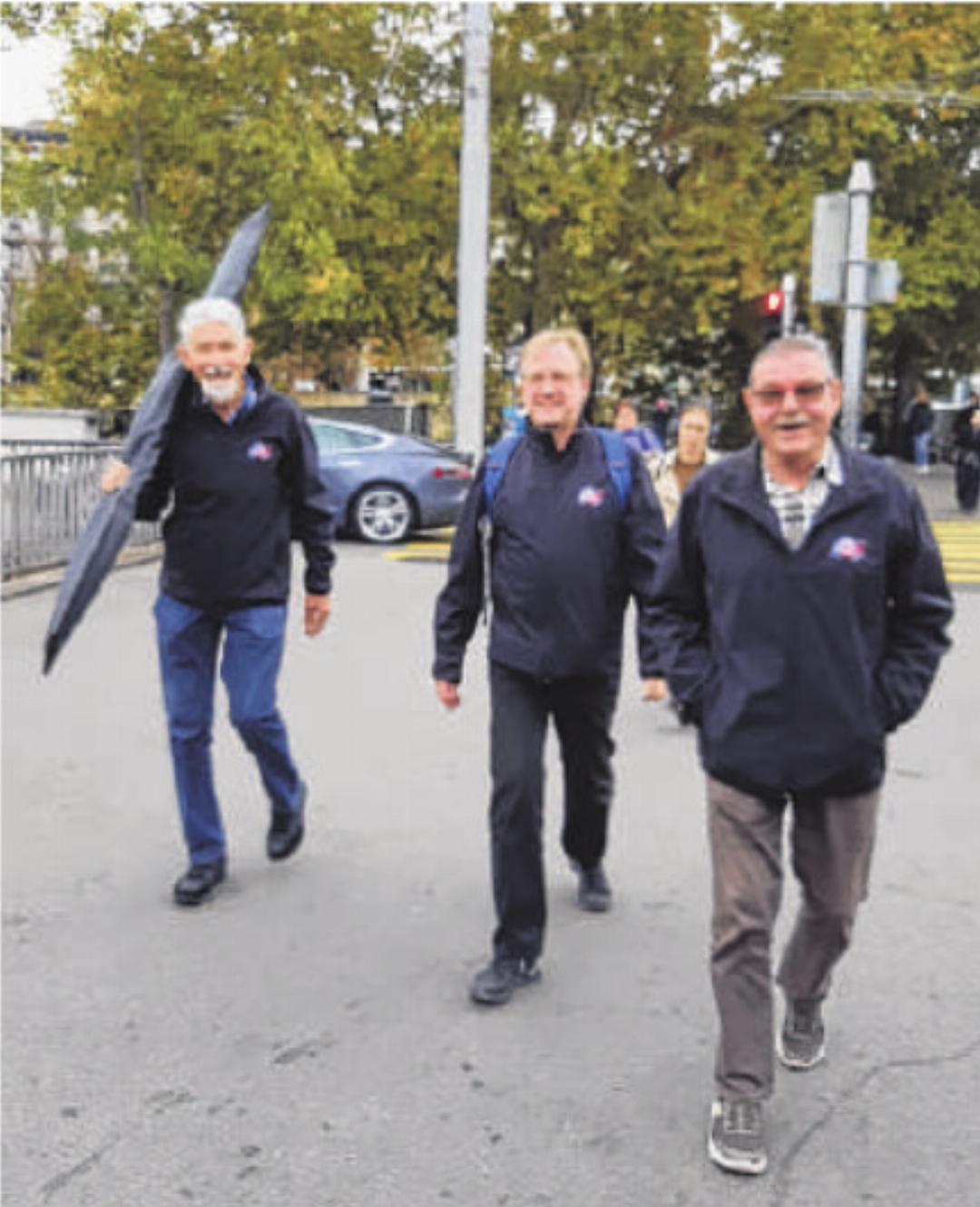Vor zwei Wochen trat eine Gruppe des Musikvereins Oberwil eine geheime Mission an. Es galt, bei der Firma Heimgartner AG in Wil/SG die neue Vereinsfahne in Empfang zu nehmen. Auf dem Rückweg legte die Gruppe einen Mittagshalt im Zürcher Niederdorf ein. Somit durfte die neue MVO-Vereinsfahne – wenn auch noch gut verpackt – schon durch Zürich getragen werden. Unser Bild zeigt v.l.n.r. den 1. Fähnrich, Joe Lötscher mit der verpackten Fahne, Holger Heine, 2. Fähnrich und Hugo Ley, Spendensammler, auf dem Weg durch Zürich. Gekleidet in die neue MVO-Softshelljacke wirkt das Bild wie ein «Fan-Marsch» durch Zürich.