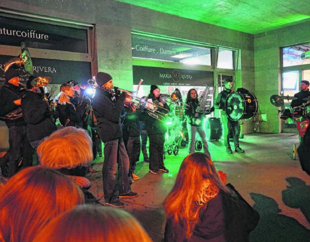 Schon von weit her sind die Klänge der Blasinstrumente und die Schläge der Pauken zu hören. Der Einmarsch der Samba Schnoogge mit ihren grün leuchtenden Instrumenten lässt das Fasnachtsfieber auf dem Löwenareal am Samstagabend ein erstes Mal ansteigen. Wenig später stossen auch die 99er Durlips dazu und geben den zahlreich anwesenden Besucherinnen und Besuchern ein Platzkonzert. Bereits beim italienischen Klassiker «Sarà perché ti amo» bleibt kein Bein mehr ruhig. Die Samba Schnoogge führen die Party nach der Ansprache von Komiteepräsident Tristan Faes mit der «W. Nuss vo Bümplitz» und «Freed from Desire» unvermindert weiter.