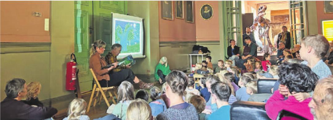 Am 15. Oktober wurde im Naturhistorischen Museum das dritte Kinderbuch der Autorin Mena Kost, «Dino und Donny im Frühling» (erschienen im Friedrich Reinhardt Verlag), feierlich vorgestellt. Trotz des herbstlichen Datums zog das Buch mit seinem frühlingshaften Titel zahlreiche kleine und grosse Besucherinnen und Besucher an – viele kleine Dino-Fans mit ihren Familien fanden den Weg ins Museum. Der Andrang war so gross, dass der Platz knapp wurde. Einige mussten sogar vom Gang aus in den Saal hineinlauschen. In der Mitte befand sich eine Leinwand, wo sich schon erste Eindrücke vom Buch erhaschen liessen.