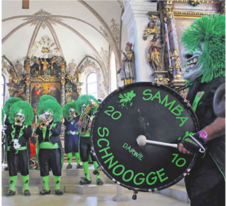 Frau Fasnacht, nimm uns an der Hand und entfiehr uns ins Fasnachtsland, das Land, wos Räppli und Dääfi rägnet, und mit schreege Döön uns sägnet. Nimm uns doch dä Wunsch nit krumm, im Fasnachtsgottesdienscht bitte mr drum. Am Morge am 10i löömer loos Für alli zämme, Glai und Gross, Kunnsch in zivil oder goschdümiert Isch doch gliich, s wird kain prämiert. Mit de Samba-Schnoogge und Orgele-Musig Wirds alles andere als gruusig.