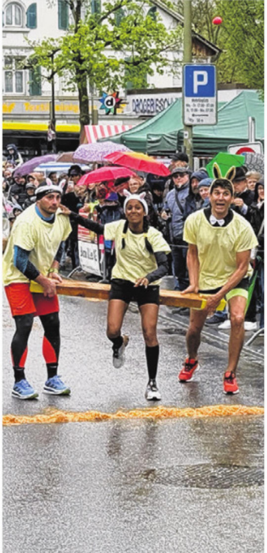 Ein weiterer Fixpunkt des Eierleset sind die Plauschteams. Es treten Schülerinnen und Schüler der Klasse 1c des Thomasgarten-Schulhauses gegen Lehrerinnen und Lehrer des Marbachschulhauses an, die sich «Eggucation» nennen. «Die Plauschteams sind für die Stimmung wichtig», erklärt Güntert. Hier können alle mitmachen, Ideen einbringen und dem Anlass eine eigene Farbe geben. Gerade diese kreative, oft überraschende Seite wirke ansteckend, belebe das Ganze und motiviere ja vielleicht sogar weitere Gruppen, mitzumachen. Mit dem Aufnehmen und In-den-Korb-Werfen der Eier ist es hier allerdings nicht getan. Es gehören Zusatzaufgaben dazu: Eine Lehrerin wird von zwei Kollegen auf einem Balken durch den Parcours getragen, später drehen sich die Athletinnen zehnmal Kreis, bevor sie losrennen. Jetzt zeigt sich, dass es beim Eierleset nicht nur aufs Tempo ankommt, sondern auch aufs Gleichgewicht – und die Fähigkeit, trotz Schwindel genau zu zielen.