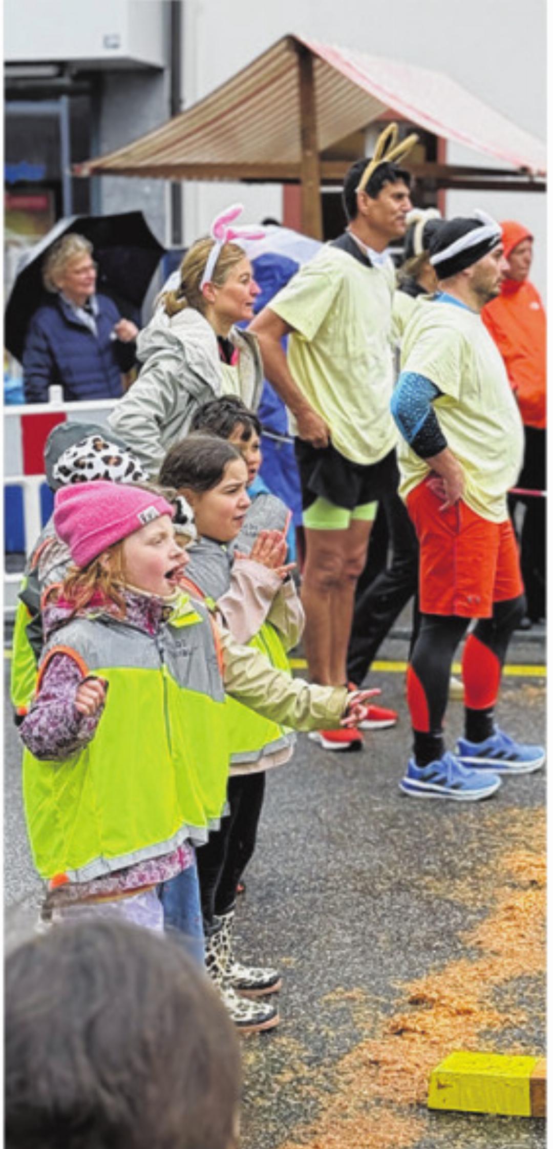 In der Festwirtschaft entlang der Hauptstrasse gibt es Snacks und Getränke. Neben Hotdogs und Bratwürsten werden Spiegeleier serviert. Sehr gefragt sind die Plätze unter dem Dach, wo die Leute gemütlich zusammensitzen. An einem der Verpflegungsstände streichen zwei Helferinnen Eiermasse auf Toastbrot. «Das Grünzeugs will ich aber nicht!», ruft ein hungriger Kunde lachend und zeigt auf die Petersilie, die sich aufs Brot verirrt hat. Derweil füllt sich die Hauptstrasse langsam aber sicher mit Publikum. Alle Alter sind vertreten. Regenschirme und Kapuzen dominieren das Bild. Es sind weniger Leute als letztes Jahr. Damals lockte das milde Wetter schon vor dem Start viele Leute an. Dieses Jahr kommen die meisten direkt auf den Anlass – wetterfest angezogen statt in kurzen Hosen wie vergangenes Jahr.