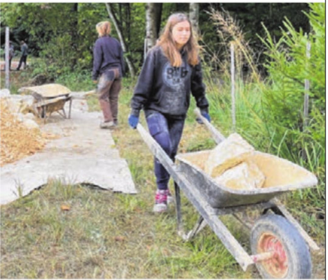 Mittags kochten wir über dem Feuer, was viel Spass machte! Zwei aus der Klasse brachten Lautsprecher mit, und wir hörten Musik beim Arbeiten. Es war schön, draussen zu sein, auch wenn es manchmal kalt war. Das Graben war zwar anstrengend, aber auch toll. Am dritten Tag war unser Weiher fertig und ein Kamerateam filmte uns bei der Arbeit.
