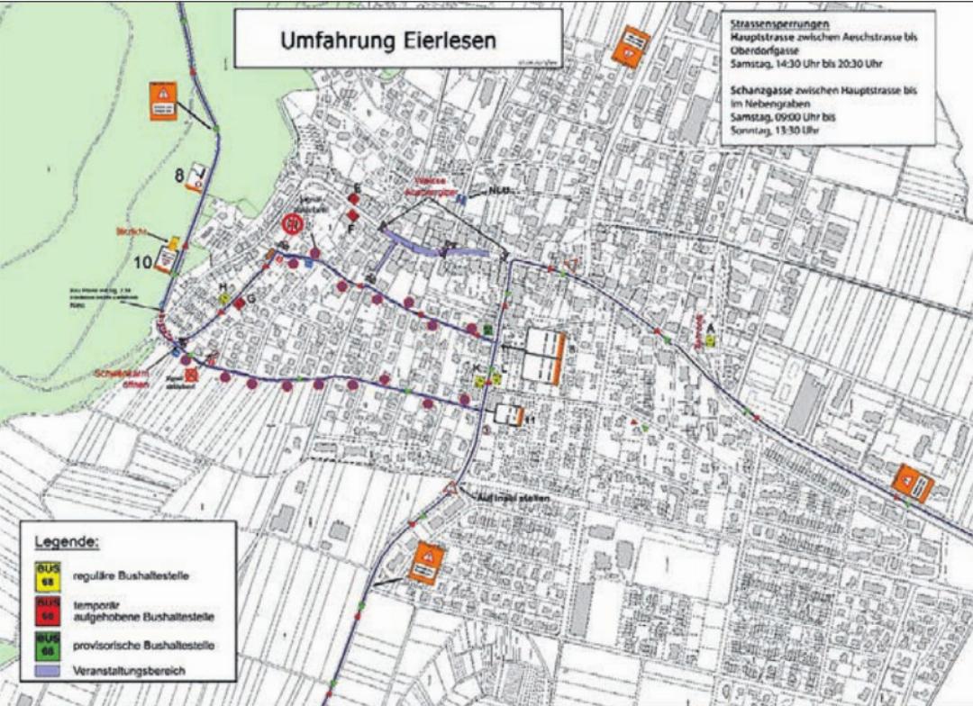 • Schanzgasse zwischen Hauptstrasse bis zum Im Nebengraben. Sperrzeiten: Samstag, 11. April, 9 Uhr, bis Sonntag, 12. April, 13.30 Uhr