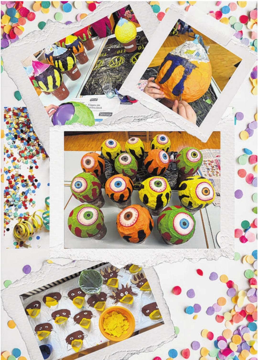 Bis zuletzt bleibt es natürlich ein Geheimnis, welche Klasse auf welche Art fasnächtlich verzaubert wird. Aber aufmerksame Besucher*innen erhaschen dennoch hin und wieder einen kleinen Hinweis: Hier ein kurzer Blick hinter eine Klassenzimmertüre und eine Sammlung riesiger Augen blicken dir entgegen, dort eine kleine Zauberin, die durch die Gänge huscht und testet, ob ihr Hut auch hält, wenn sie sich schnell bewegt oder viele filigrane Papierfedern, die zu einer Schar lustiger Spatzen gehören.