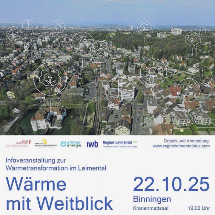 An der Infoveranstaltung am 22. Oktober im Kronenmattsaal Binningen (Beginn: 19 Uhr, kostenlos, Anmeldung erbeten) informieren Vertreterinnen und Vertreter von Kanton, Gemeinden und Energiefachleute der Baselbieter Energieberatung, von Primeo Energie, IWB, BLKB und Installationsunternehmen über Chancen und Herausforderungen der Wärmetransformation. Anschliessend Apéro und individuelle Beratung an Infoständen.